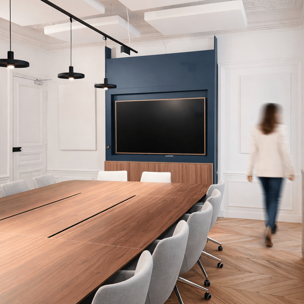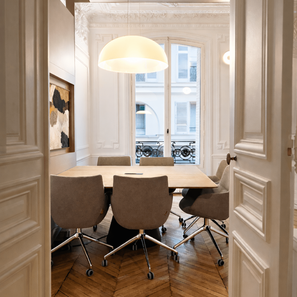 L’objectif était de créer un environnement de travail cohérent, réunissant open-space, bureaux et salles de réunion, tout en respectant l’identité et l’organisation de l’entreprise. L’aménagement s’inscrit dans un style haussmannien dont les moulures et éléments architecturaux ont été conservés afin de préserver le caractère du lieu.