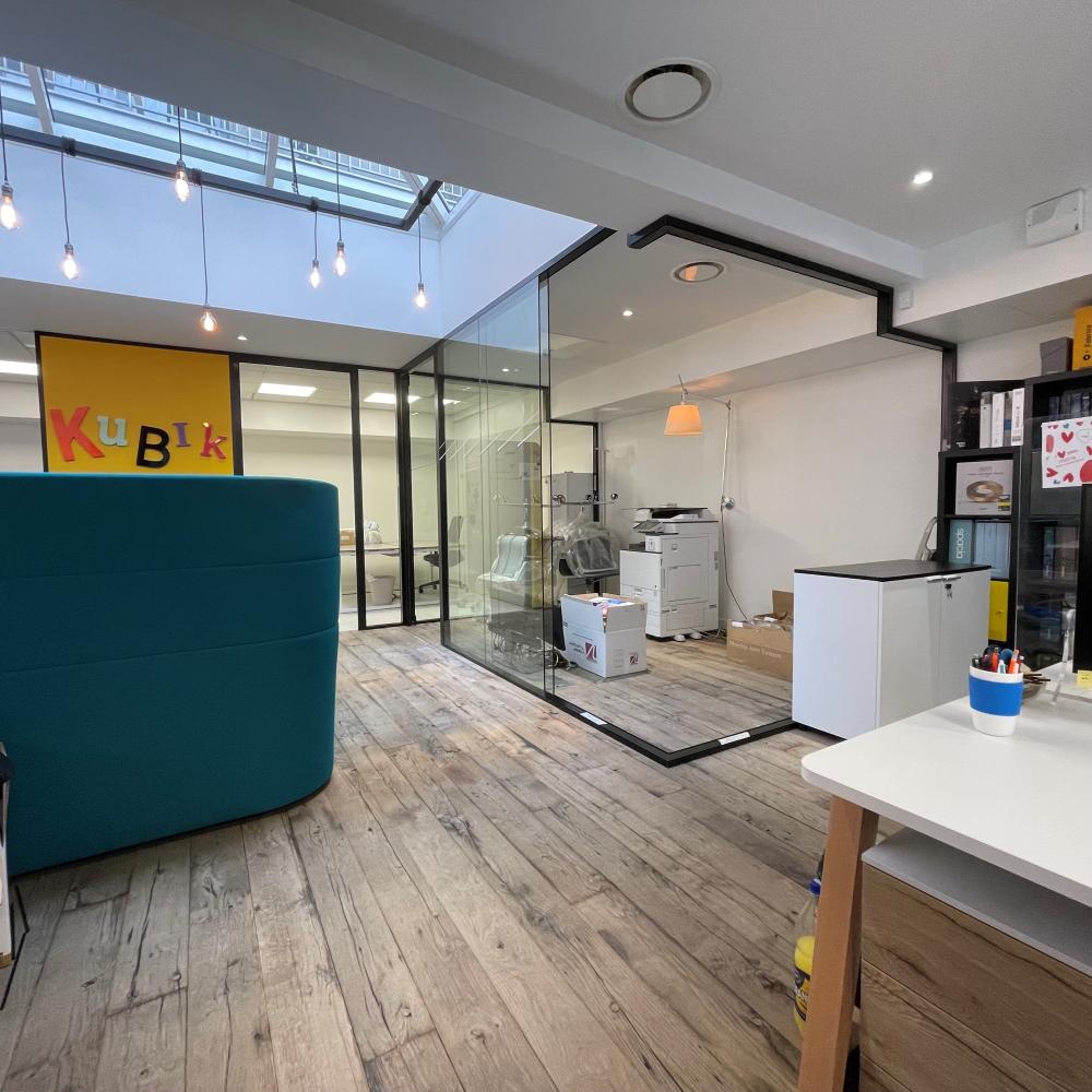 Ossature noire, vitrage bord à bord afin de laisser passer un maximum de lumière, vitrophanie légère, nous avons veillé à conserver l'âme des locaux même si nous cloisonnons davantage. Nous avons conservé les open-space, car notre philosophie s'appuie sur les interactions entre les équipes créa et le commerce.