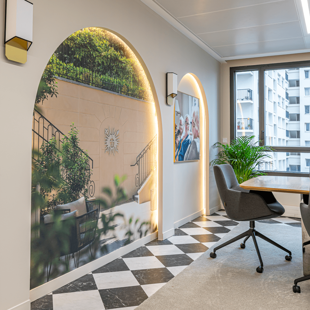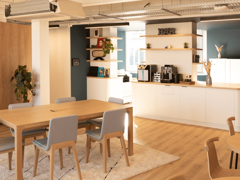 Chaque salle de réunion porte le nom d’un établissement Acapace et s’inspire de son univers : images imprimées sur toile, matières et éclairages personnalisés pour une immersion directe dans l’ADN du groupe. La tisanerie, pensée comme un espace central, associe aménagement modulable, cuisine et bar sur mesure, ciel végétalisé et banquette panoramique, créant une atmosphère conviviale.