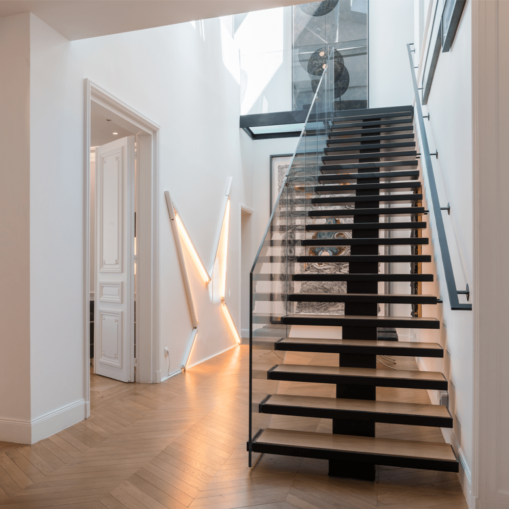 Du remaniement de la CVC, restructuration des cloisons amovibles, création de cheminées en marbre sur-mesure, d’un escalier majestueux en passant par la modification de l’intégralité des luminaires, ce projet a été un vrai défi global que nous avons relevé.