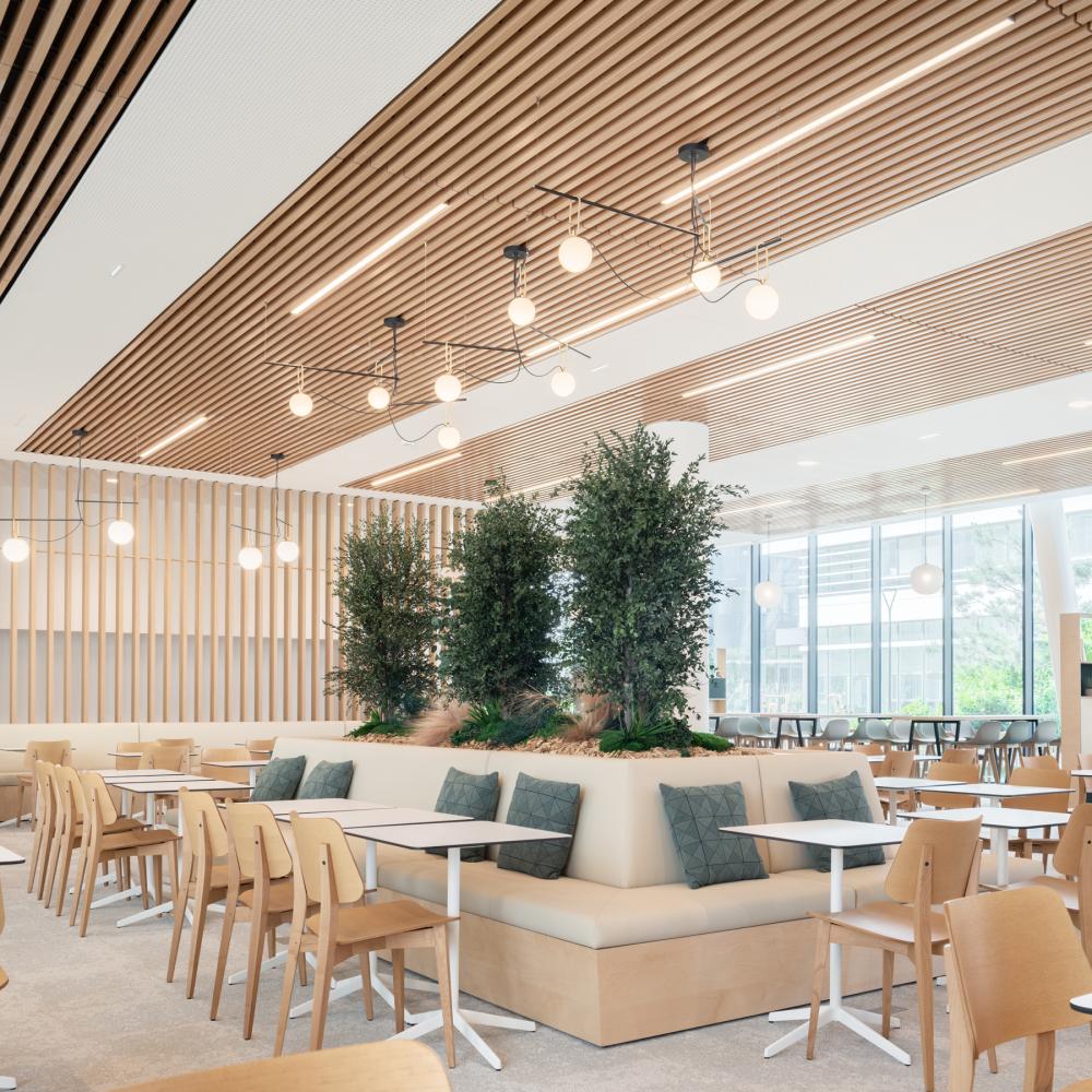 La mission de Kubik a été d'aménager les espaces communs comme le hall d'accueil, l'arena salle modulable, le RIE, espace café, salle fitness, local vélo, espace témoin & tisanerie.