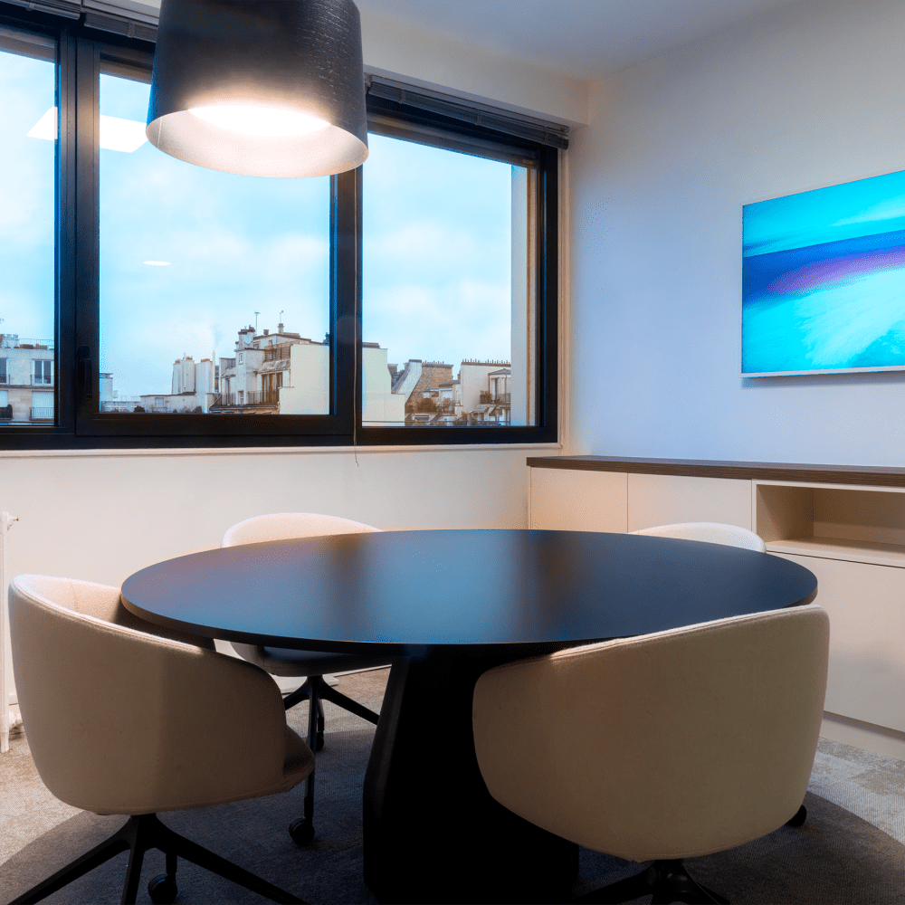Open-space sur terrasse pour les collaborateurs, salles de réunion au mobilier et agencements personnalisés, parquets massifs et moquettes épaisses, parements muraux bois et détail des éclairages architecturaux procurent un sentiment de bien-être et de convivialité apaisant.