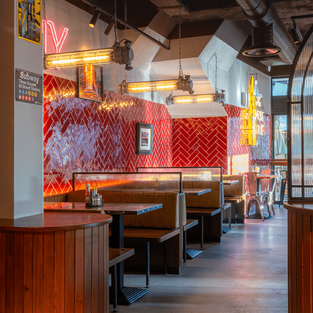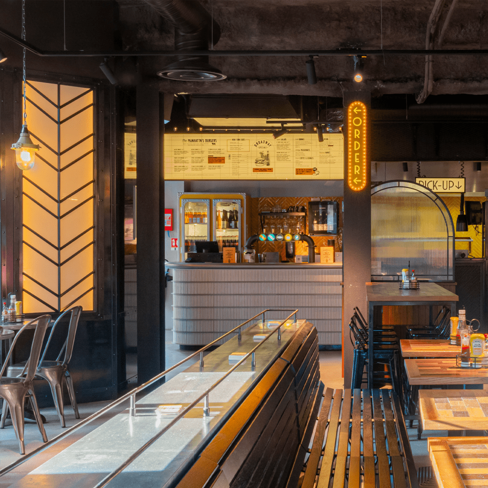 L’atmosphère des lieux mélange les matériaux et les ambiances : chaleur du bois et ton neutre des sols, modernité des éclairages et clins d’œil au passé de certaines enseignes lumineuses, sobriété de la décoration et couleurs vives des surfaces verticales, l’ensemble rappelle aisément l’ambiance New-Yorkaise chère à l’enseigne, la fameuse « New York vibe » que souhaite répandre les fondateurs en Europe.